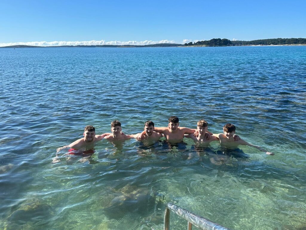 Am Dienstag wurde erstmals auf Naturrasen trainiert – eine rutschige Angelegenheit. Bei strahlendem Sonnenschein nutzten einige Spieler die Gelegenheit für ein kurzes Bad im Meer oder einen Spaziergang im Hafen von Medulin.